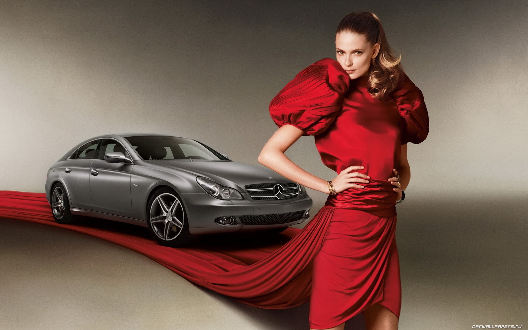 Modello in abito rosso sullo sfondo di un'auto mercedesModello in abito rosso sullo sfondo di Un'auto Mercedes