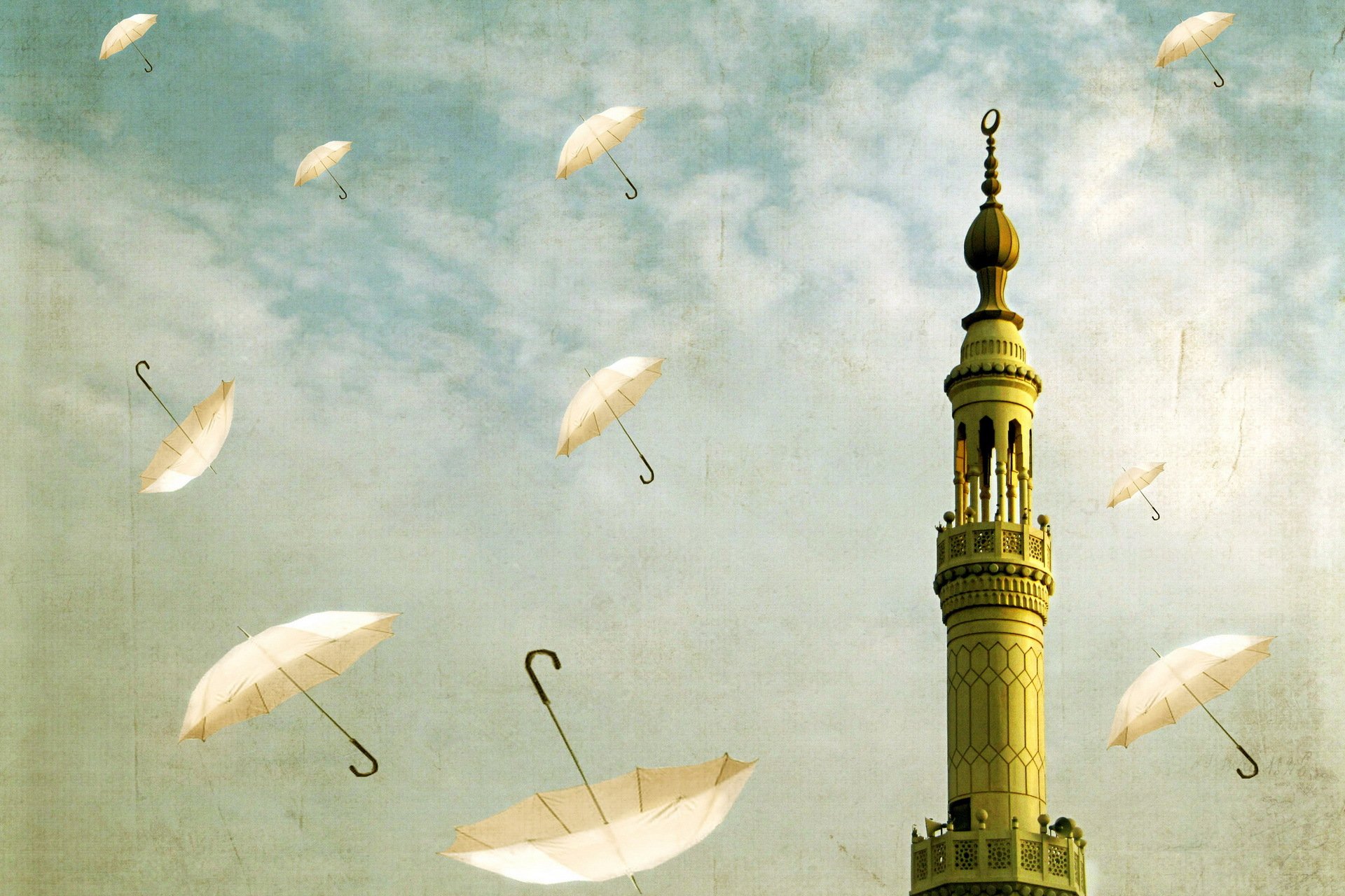 Ombrello giallo con manico nero e ombrello rosso con cuori sulla parete biancaOmbrello giallo con manico nero e ombrello rosso con cuori sulla parete bianca