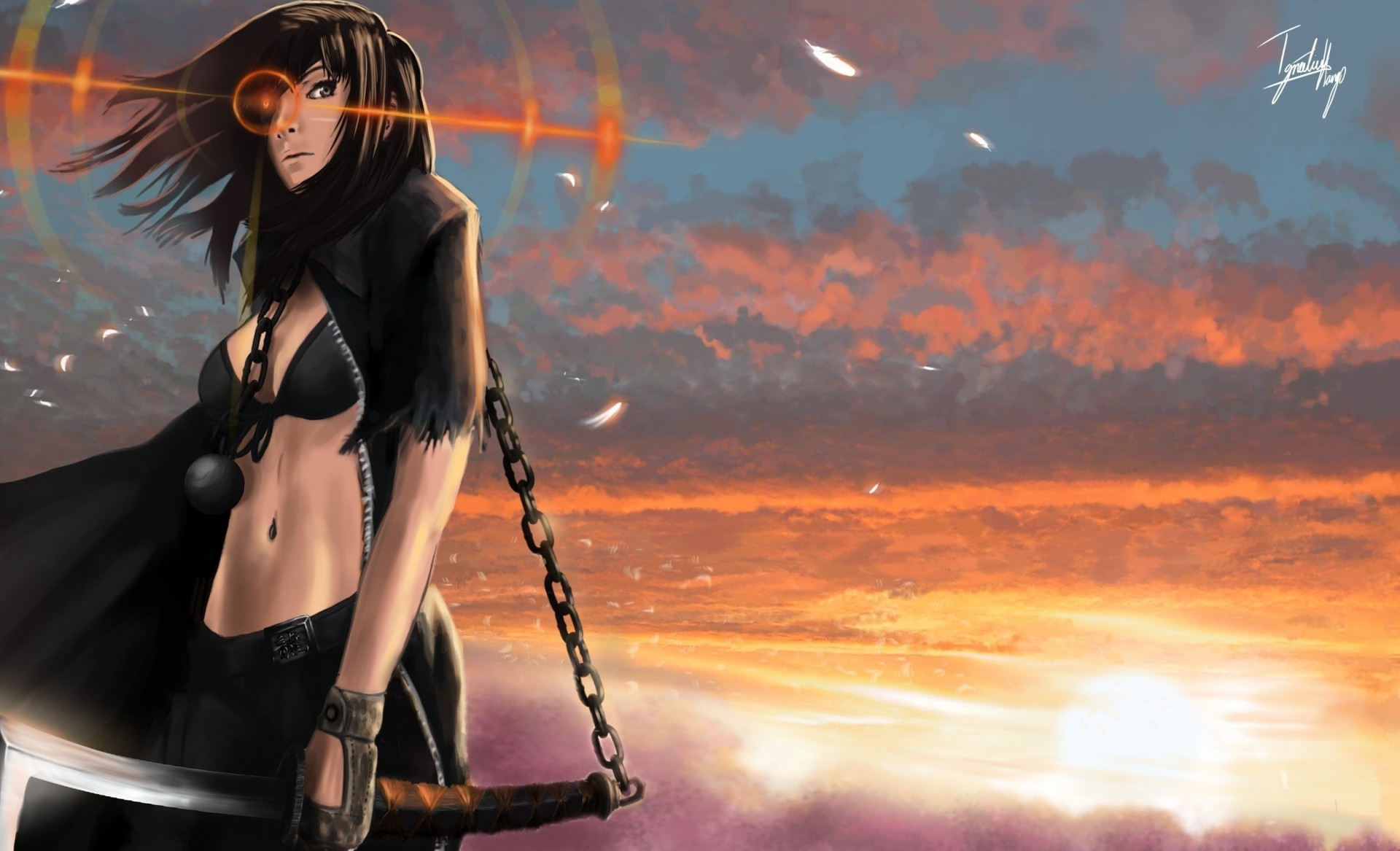 Bella ragazza con flauto sullo sfondo di montagne viola e tsunamiBella ragazza con flauto sullo sfondo di montagne viola e tsunami