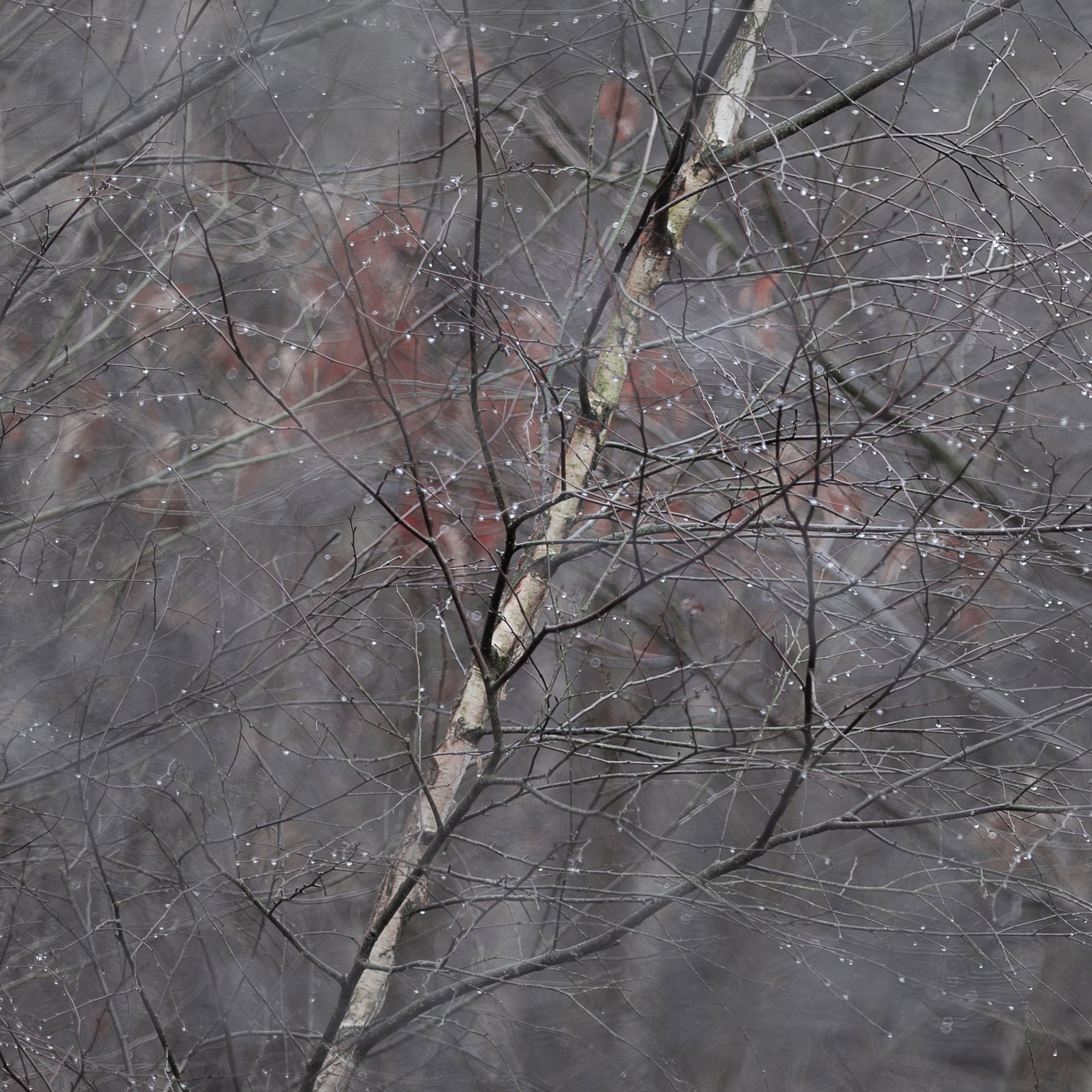 Uccellino sul recinto sotto la pioggia battente e la nebbia fittaUccellino sul recinto sotto la pioggia battente e la nebbia fitta