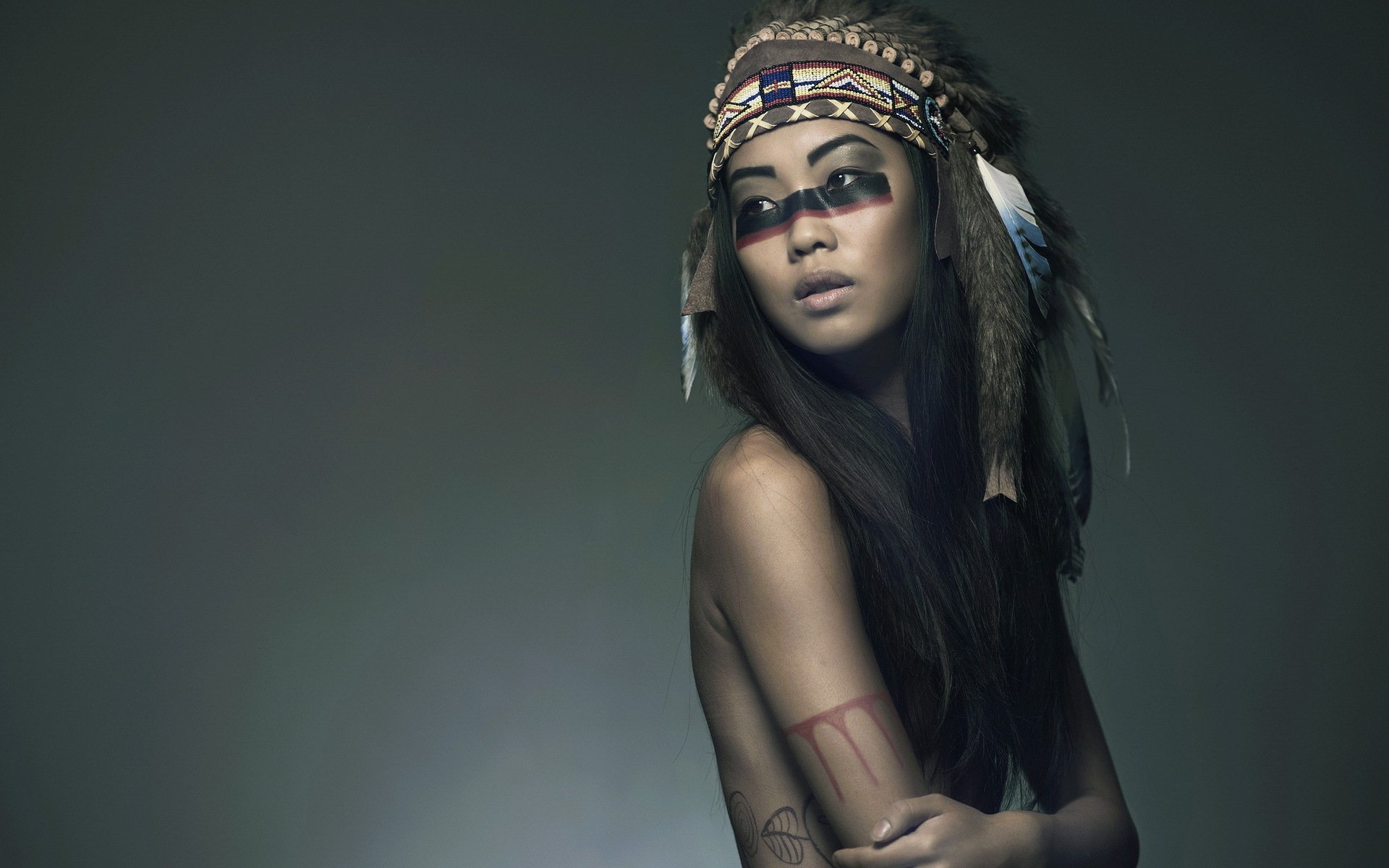 Ritratto di ragazza con trucco e fascia rossa sui capelliRitratto di ragazza con trucco e fascia rossa sui capelli