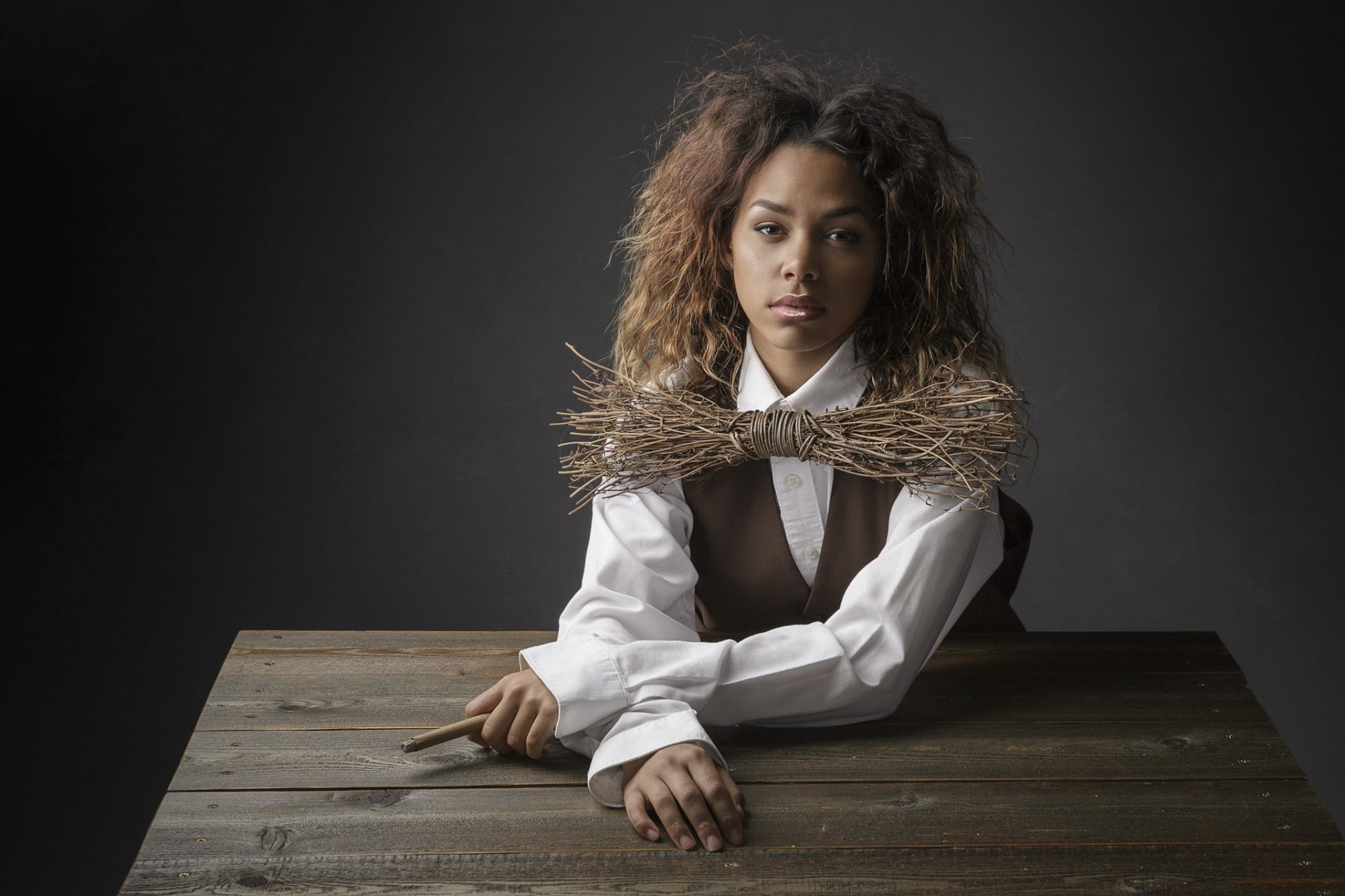 Ragazza dalla pelle scura riccia con decorazione di piume sull'orecchioRagazza dalla pelle scura riccia con decorazione di piume sull'orecchio