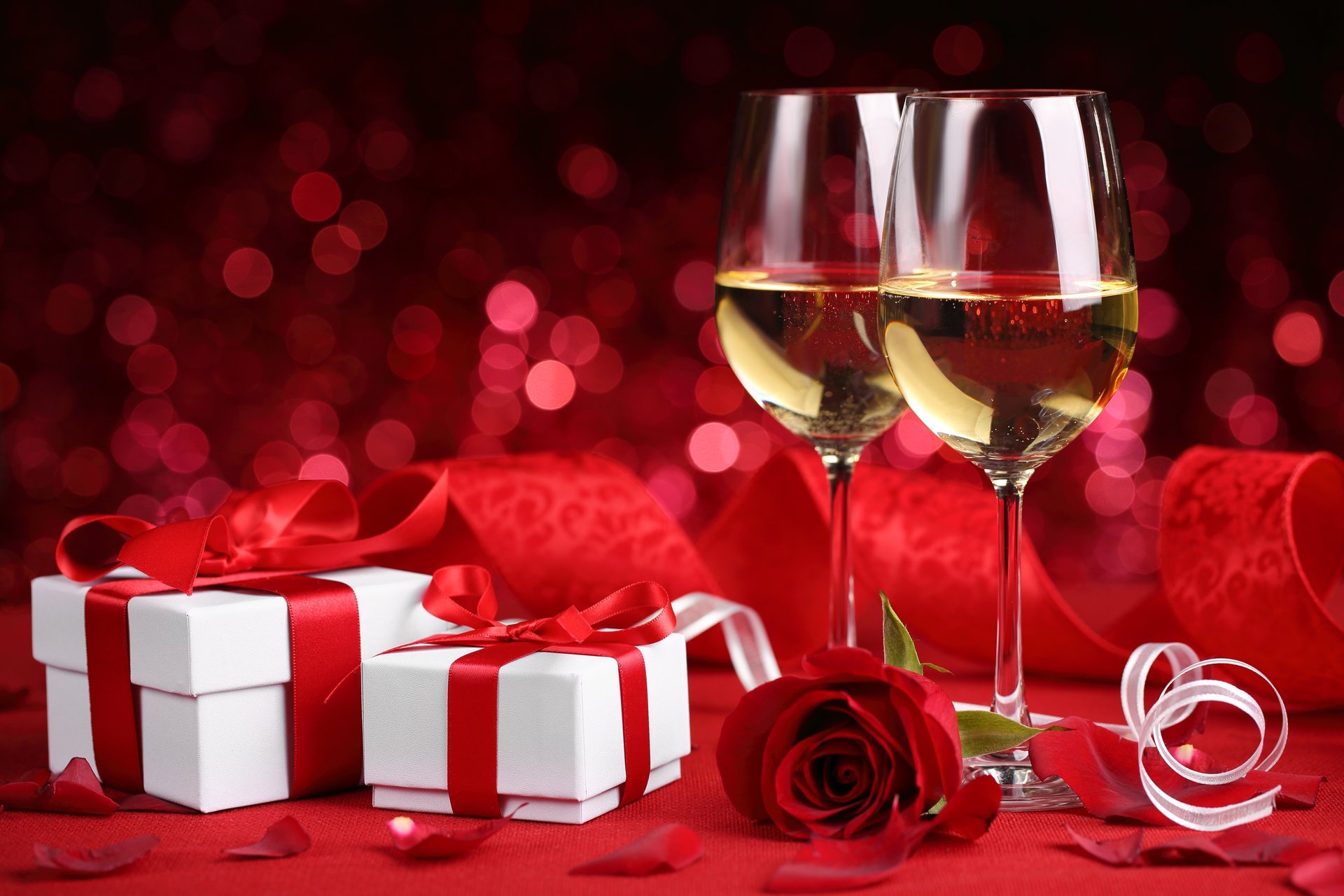 Bicchieri di champagne con Rosa rossa e regali