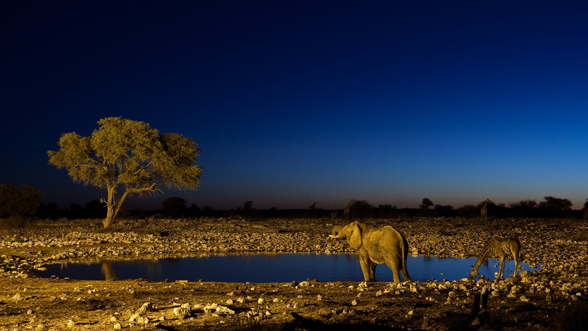 Elefante e giraffa in un abbeveratoio di notte in africaElefante e giraffa in un abbeveratoio di notte in Africa