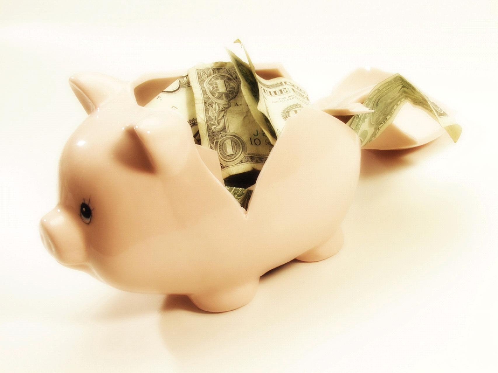 Salvadanaio mezzo rotto con soldi a forma di maialeSalvadanaio mezzo rotto con soldi a forma di maiale