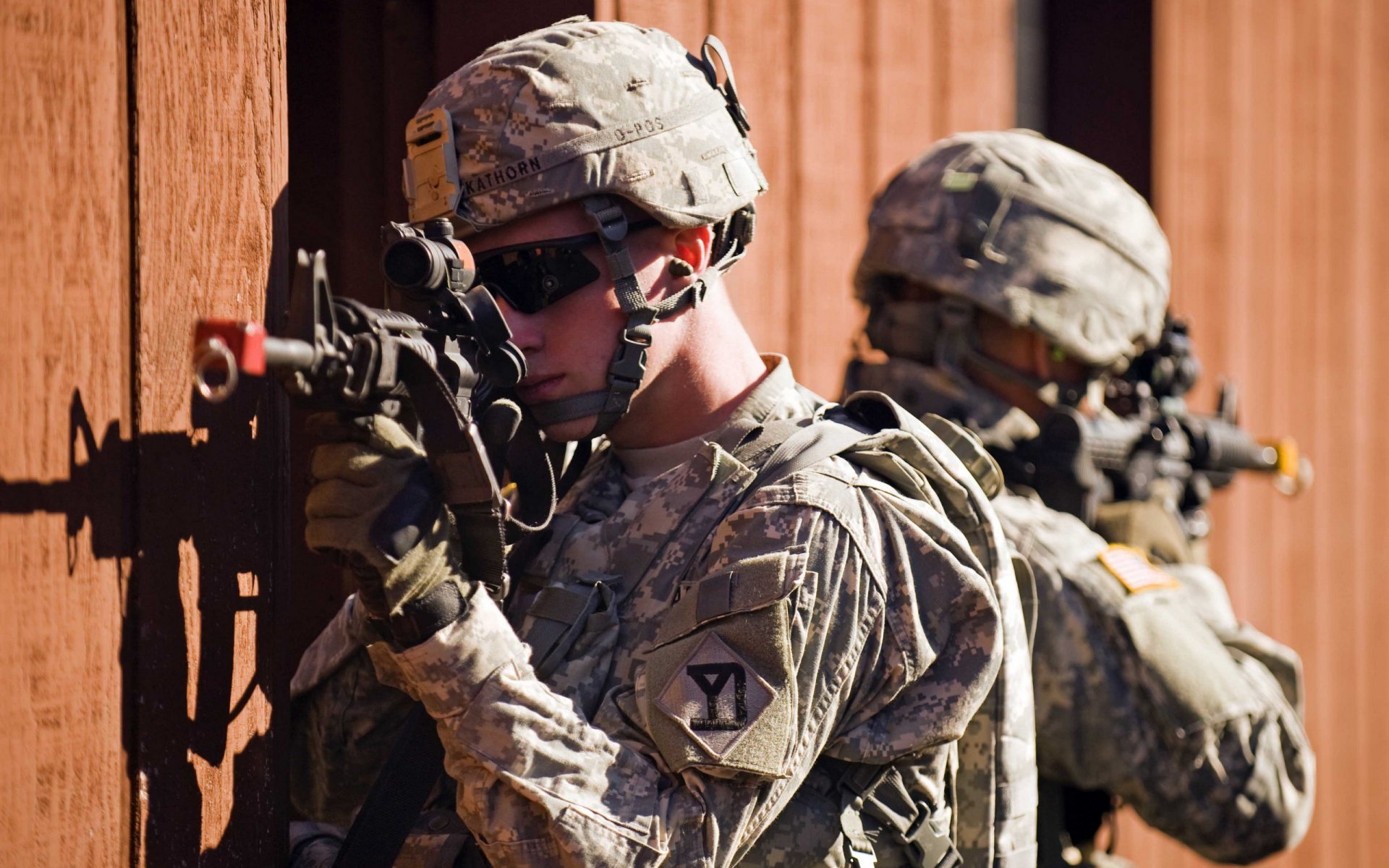 Soldati al riparo della luce della torcia elettrica della catenaSoldati al riparo della luce della torcia elettrica della catena