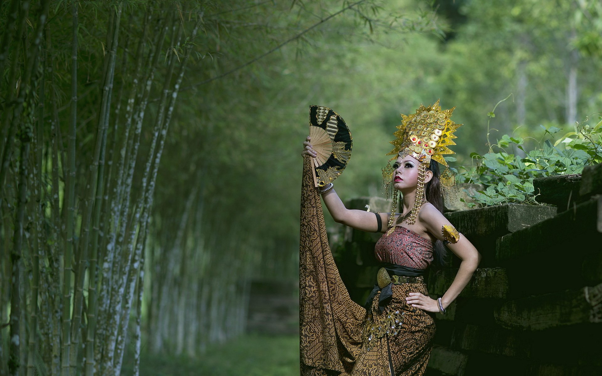 Bella ragazza con un ventilatore su uno sfondo di alberi verdiBella ragazza con un ventilatore su uno sfondo di alberi verdi