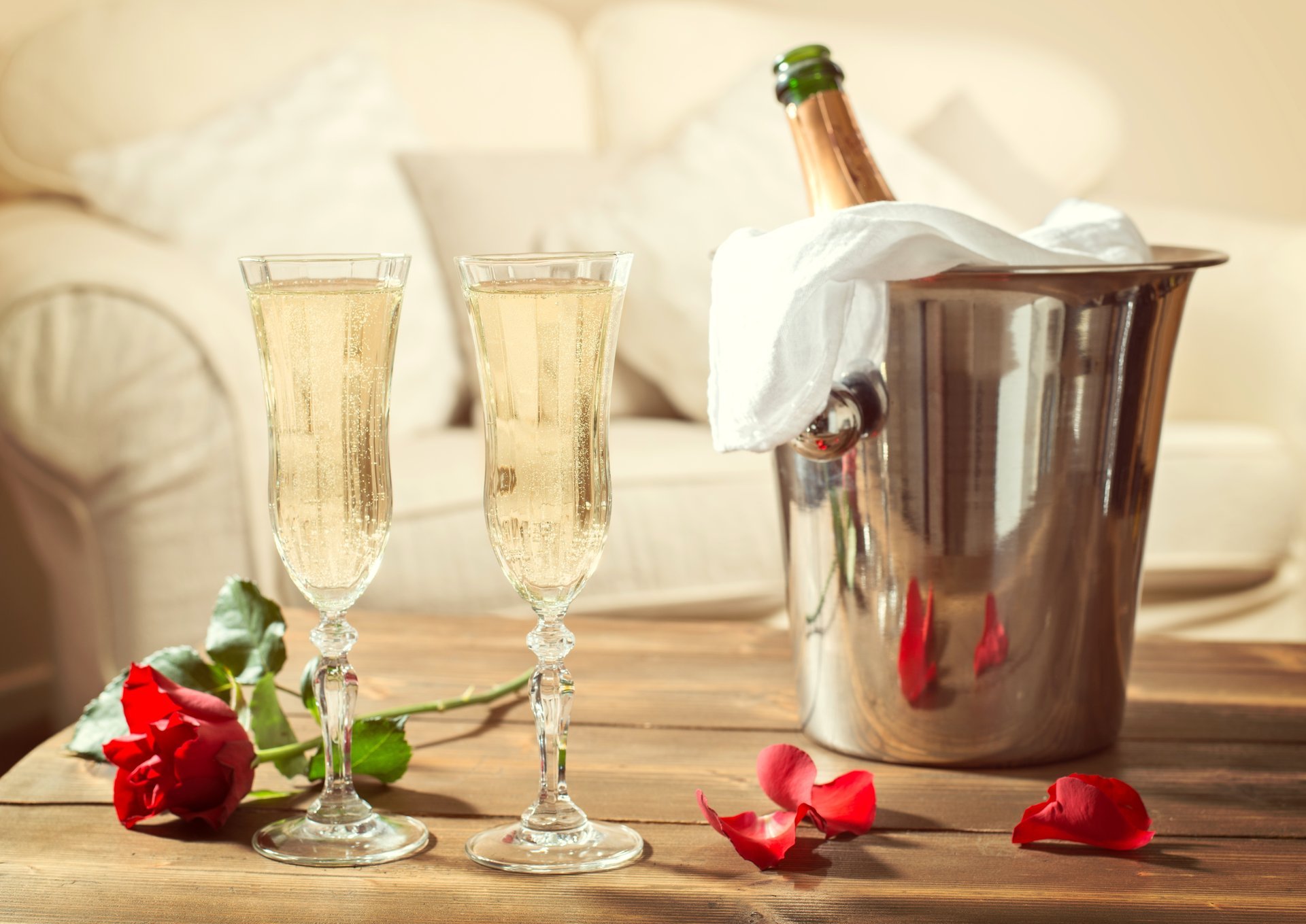 Due bicchieri e champagne in un secchio sul tavoloDue bicchieri e champagne in un secchio sul tavolo