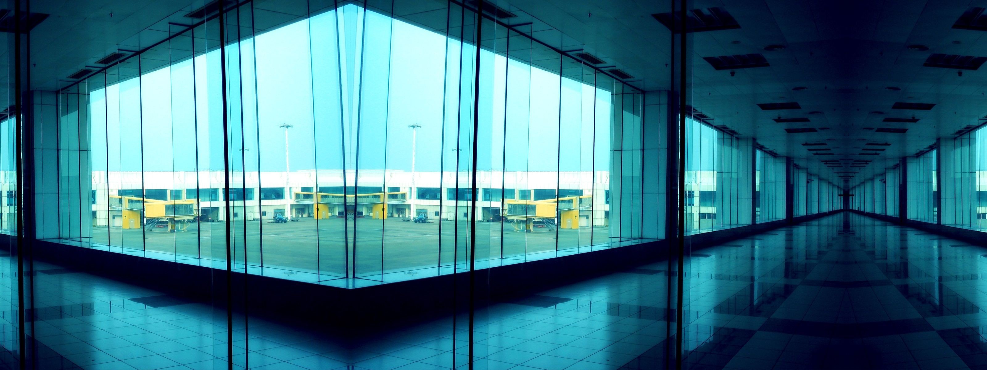 Corridoio di vetro con finestre che si affacciano sul cortile