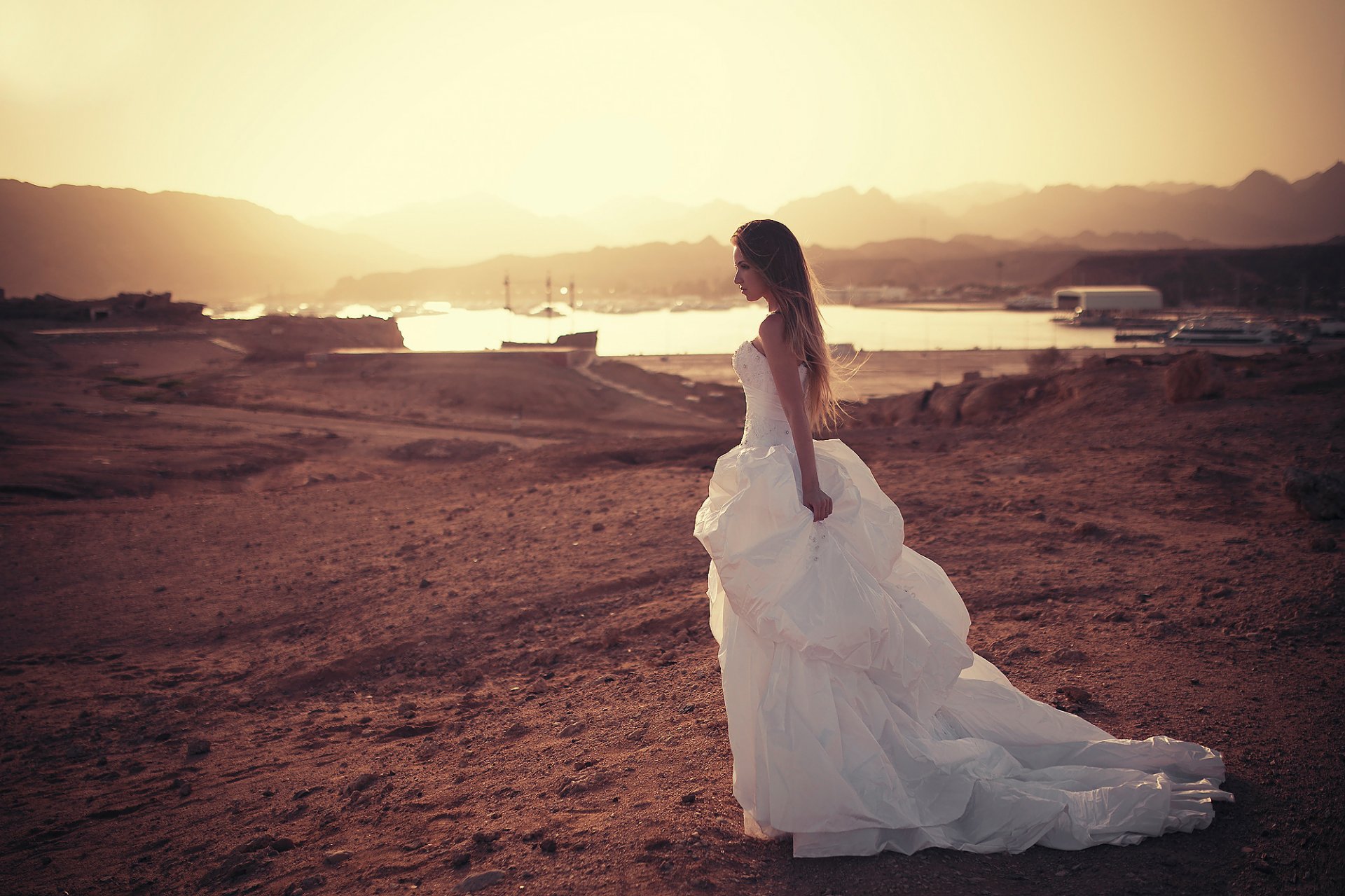 Immagine della sposa: abito bianco, cappello, guanti, collana